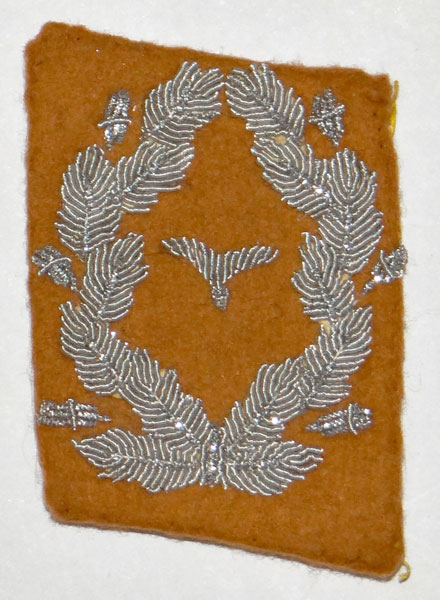 Single tab, hand embroidered in silver aluminum bullion wire on light brown. Tab is missing the silver twisted piping around the edge and the inside stiffener is missing. Tab could just be unfinished, otherwise very nice. Exc. + $20.00