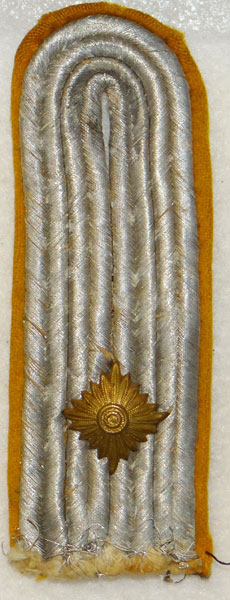 Single sew in type board with golden yellow wool underlay with bright silver aluminum braid with one gold rank pip. Shows wartime field wear and age, still nice. Exc. $25.00