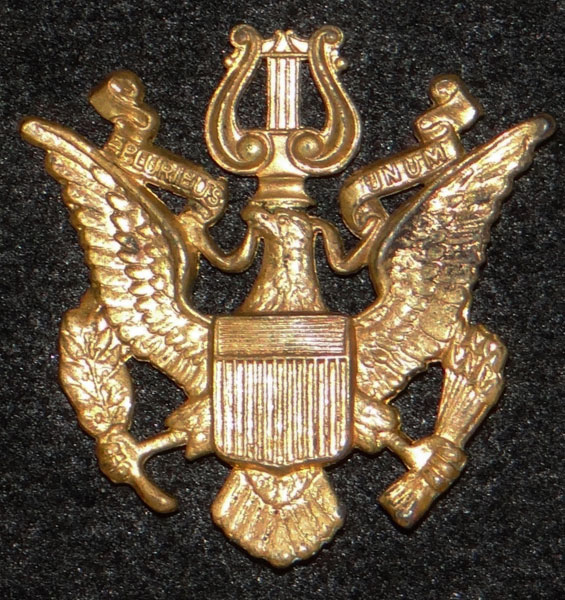 1920 /1940's made of brass with gold plated finish with nice detail. Insignia is about 2-1/8 inches high and about 2-1/8 wide at wing tips. Screw back with some age and wear. Exc. + $40.00 RARE