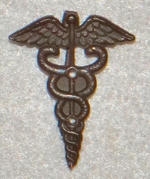 Full size collar insignia with very dark bronze finish, with two small holes on front for adding medical branch insignia if needed. Pin back, looks unused with light age, single. High Exc. + $17.50